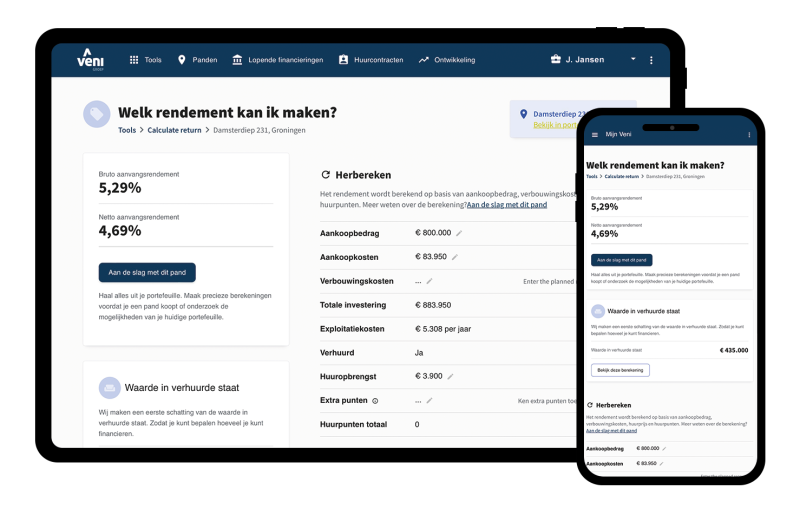 Al deze factoren hebben invloed op de hoogte van het rendement van een vastgoedbelegging. Door deze factoren zorgvuldig af te wegen, krijg je inzicht in het maximaal te behalen rendement. Het is belangrijk om te weten dat je bij ons invloed hebt op de geschatte gegevens en toekomstige scenario’s kunt invoeren. Zo kun je bijvoorbeeld bepalen of een verbouwing van een pand een slimme keuze is.